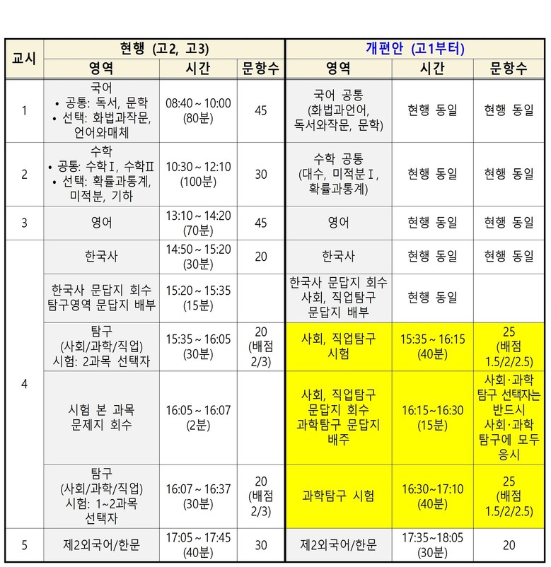 2028 대입은 사회·과학탐구가 현행 수능과 크게 달라진다. 사회·과학탐구 문항수가 각각 20개에서 25개로 5개씩 늘어나고, 배점은 1.5/2.0/2.5점 등 3단계로 이뤄진다. 시험 시간도 사회 40분, 과학 40분으로 기존보다 10분 늘어난다.