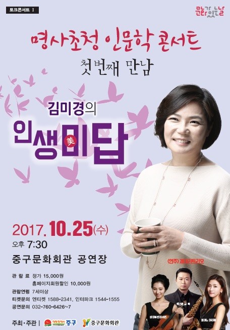 중구문화회관에서는 10월~12월 문화가 있는날 특별 시즌 기획으로 『명사초청 인문학 콘서트』를 준비했으며 10월 25일 ‘김미경’, 11월 29일 ‘김성녀’에 이어 12월 27일 ‘임진모’까지 총 3번의 만남을 준비했다.