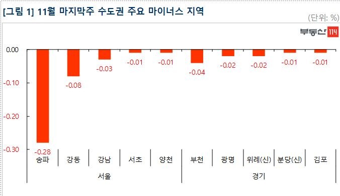 부동산114(www.r114.com)에 따르면 11월 마지막 주 서울 아파트 매매가격은 0.04%(재건축 -0.08%, 일반 -0.03%) 떨어지며 지난주의 -0.03% 대비 하락폭이 커졌다. 송파구와 강동구 일대에 위치한 재건축아파트 중심으로 수요가 위축되고 거래가 끊기면서 하락폭이 확대되는 양상이다. 다만 신도시(0.00%)와 경기·인천(0.00%) 지역은 전주와 마찬가지로 보합 수준에서 움직임은 크지 않았다.