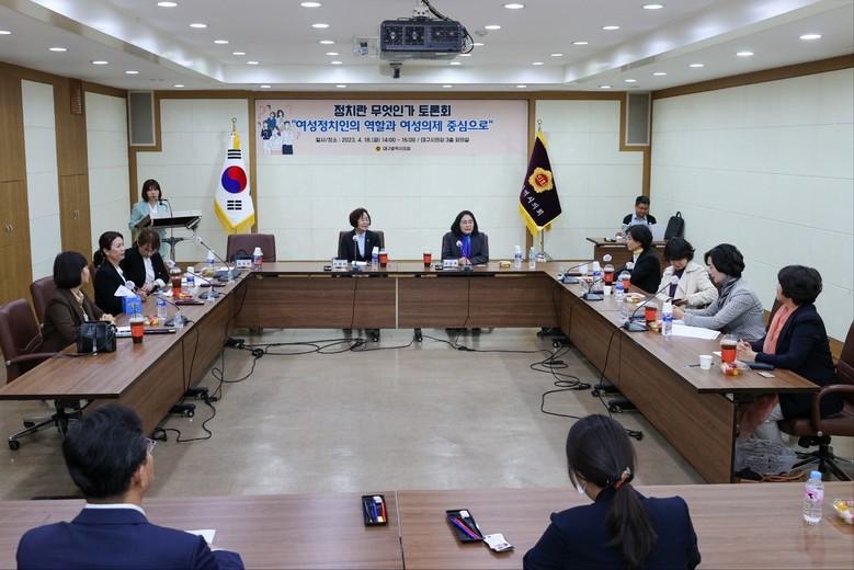 [대구 세계타임즈=한성국 기자] 대구시의회 육정미 의원(교육위원회, 비례)은 18일(화) 오후 2시 대구시의회 3층 회의실에서 ‘정치란 무엇인가?(여성정치인의 역할과 여성의제를 중심으로)’를 주제로 토론회를 개최했다.