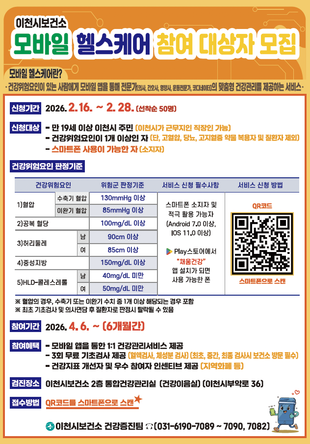 모집 대상자는 건강위험요인(혈압, 공복혈당, 허리둘레, 중성지방, HDL콜레스테롤) 중 1개 이상 보유하고 있는 19세 이상 이천시 거주자 또는 직장인이며, 스마트폰을 소유하고 적극 활용할 수 있어야 한다. 단, 고혈압, 당뇨, 고지혈증 약물 복용자 및 질환자는 제외된다.
