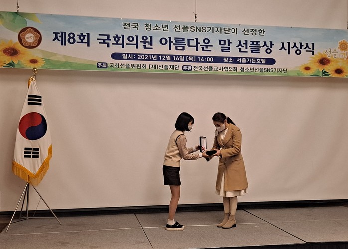 김 의원은 “우리나라 미래의 주역이 될 학생 기자단이 선정해주신 상이기에 더욱 뜻깊게 느껴진다”며 “아름다운 글과 말로 긍정에너지를 전파하자는 선플운동의 취지처럼, 앞으로도 정제된 언어와 올바른 정치를 통해 선한 영향력을 실천할 수 있도록 최선을 다하겠다”고 수상소감을 밝혔다.
