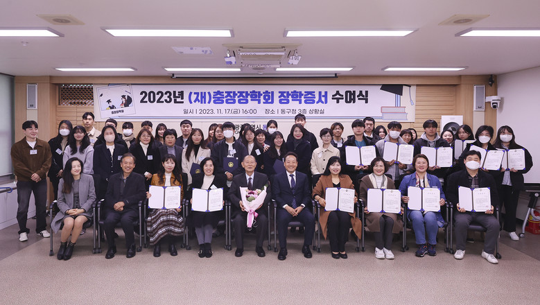 동구는 지난 17일 구청 상황실에서 열린 ‘2023년 충장장학회 장학증서 수여식’에서 김백규 이사장의 사재 출연으로 관내 대학생 40명에게 개별증서와 함께 1인당 2백만 원씩 총 8천만 원을 전달했다.