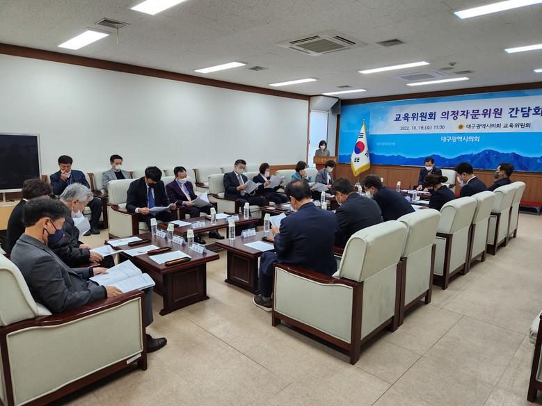 [대구 세계타임즈=한성국 기자] 대구광역시의회 교육위원회(위원장 이동욱)는 10월 19일(수) 11시 시의회 2층 간담회장에서 의정자문위원과 교육위원회 위원 등 17명이 참석한 가운데 의정활동의 내실화와 전문성 제고를 위한 의정자문위원 간담회를 가졌다.