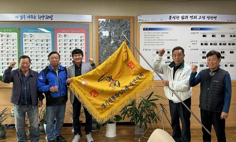 [화성시 세계타임즈=송민수 기자] 장안면 농악팀 황라두레가 6일 ‘2025년 화성시민 한마음 체육대회’ 농악 부문 ‘장원상’ 기념패 및 우승기를 장안면 행정복지센터에 전달했다.
