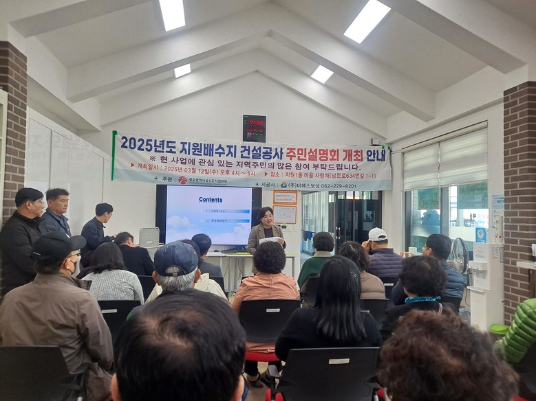 광주상수도본부는 12일 지산2동 마을사랑채에서 ‘지산배수지 건설공사’, 지원1동 마을사랑채에서 ‘지원배수지 건설공사’에 대한 주민설명회를 개최했다.