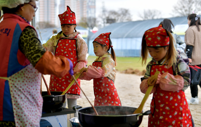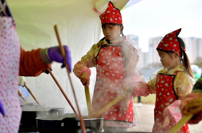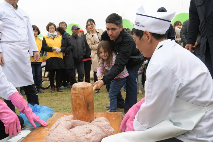 관람객들이 딸기 떡메치기 체험을 하고 있다.