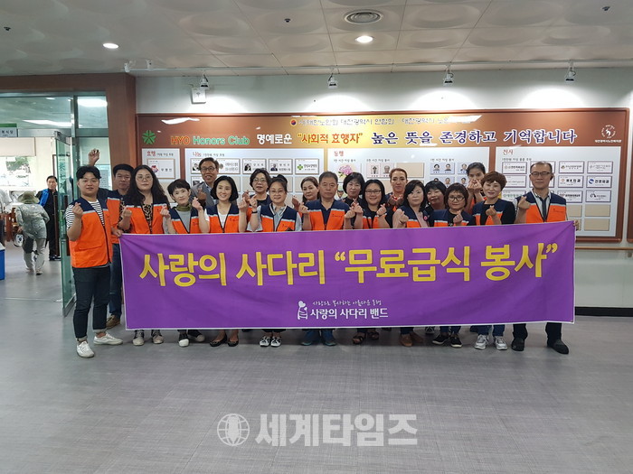 사랑의 사다리 밴드는 대전광역시 노인복지관에서 매월 첫째 주, 셋째 주 목요일 점심시간에 설거지 봉사로 사회적 효행 실천을 꾸준하게 하고 있다.