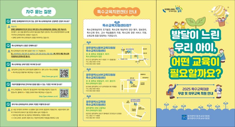 특히 '발달이 느린 우리 아이, 어떤 교육이 필요할까요?'를 주제로 ▲특수교육대상자 영아 무상교육 지원 ▲특수교육대상자 유・초・중등 의무교육 지원 ▲ 특수교육대상자 선정·배치 절차 안내 ▲자주 묻는 질문 ▲특수교육지원센터 위치 안내 등의 내용을 담았다.