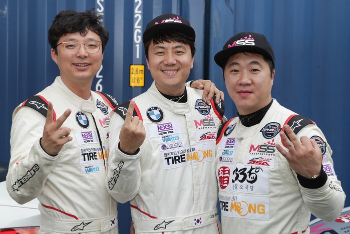 [사진설명]BMW M 클래스 예선 2위 김효겸, 1위 현재복, 3위 한명구(왼쪽부터. 이상 MSS)가 함께 기뻐하고 있다.
