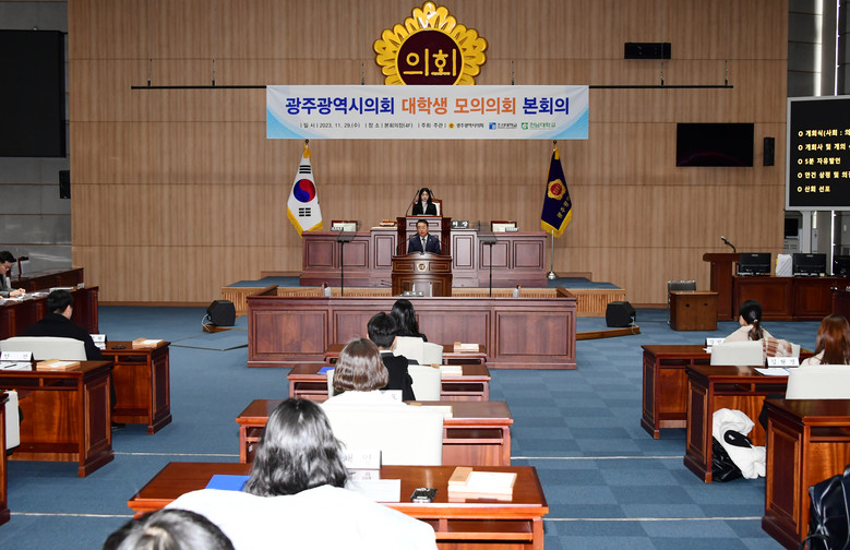 [광주 세계타임즈=손권일 기자] 광주광역시의회(의장 정무창)는 11월 29일(수), 시의회 본회의장에서 조선대학교·전남대학교와 공동으로 ‘2023년 대학생 모의의회 본회의’를 개최했다고 밝혔다.