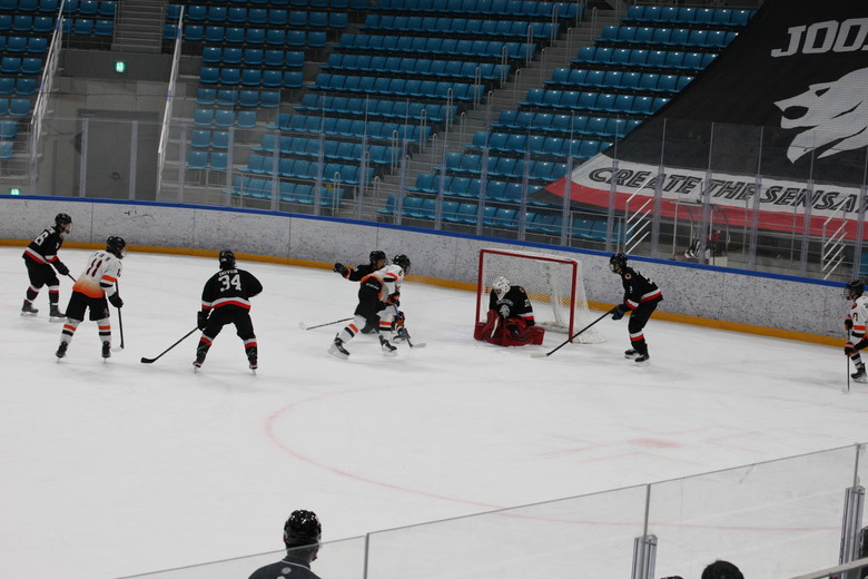 | ▲26일 강릉하키센터서 열린 ‘제107회 전국동계체육대회’ 아이스하키 15세 이하부 단체전 준결승에서 분당중 이지섭(6번)이 선취점을 올리고 있다. |