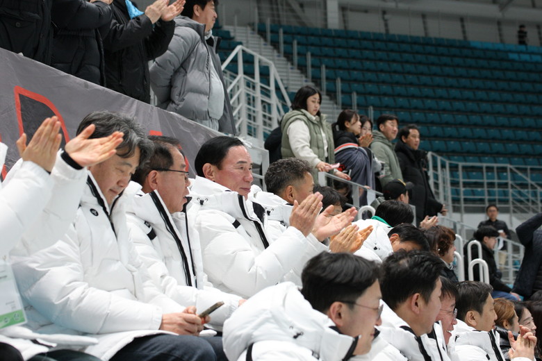 | ▲이원성 경기도체육회장을 비롯한 경기도선수단 관계자들이 26일 경기도(분당중)vs서울(중동중) 준결승전을 관전하며 열띤 응원을 펼치고 있다. |