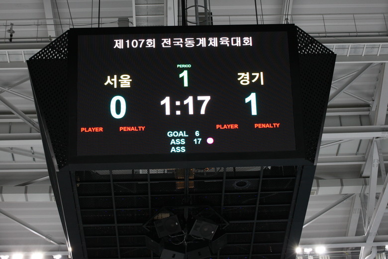 | ▲전광판에 경기도(분당중)과 서울(중동중)의 1피어리드 스코어 점수가 기록되고 있다. |