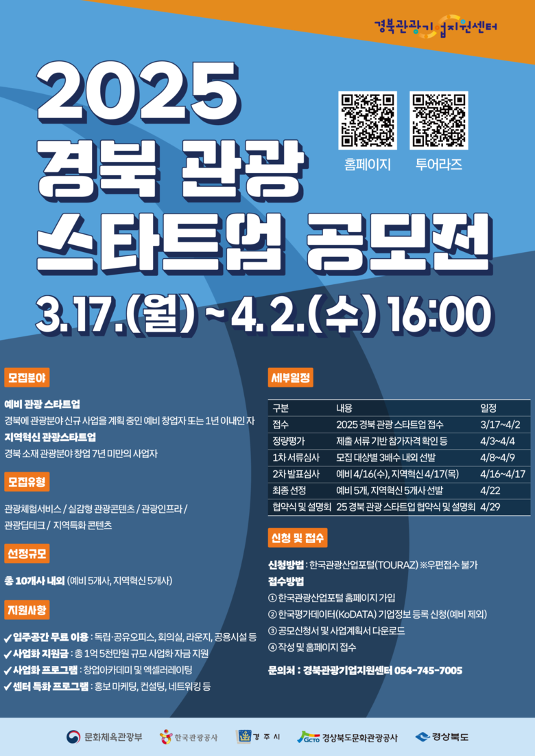 2025 경북 관광 스타트업 공모 참가를 희망하는 개인과 기업은 한국관광산업포털(TOURAZ)을 통해 신청할 수 있으며 사업자등록증을 보유한 신청자는 투어라즈 회원가입 후 한국평가데이터(KoDATA)에 기업정보를 반드시 등록한 후 신청해야 한다. 자세한 사항은 경북관광기업지원센터 홈페이지(www.tourbiz.gtc.co.kr)에서 확인할 수 있다.