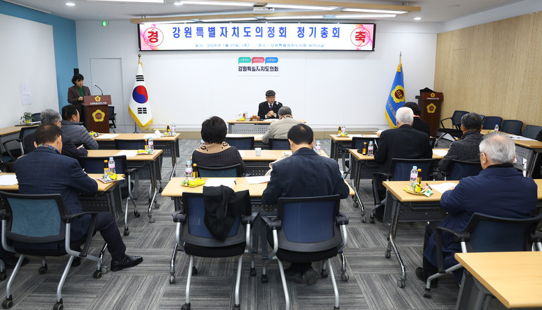 [강원도 세계타임즈=김민석 기자] 강원특별자치도의정회는 1월 27일(화) 11시.도의회 세미나실에서 2026년도 정기총회를 개최했다. 정기총회를 진행한 가운데 의정회원들이 강원특별법 3차 개정안 심사와 통과 촉구 결의문 낭독과 함께 피켓 퍼포먼즈로 강원특별자치도의 제도적 기반 강화를 위한 의지를 한데 모았다.