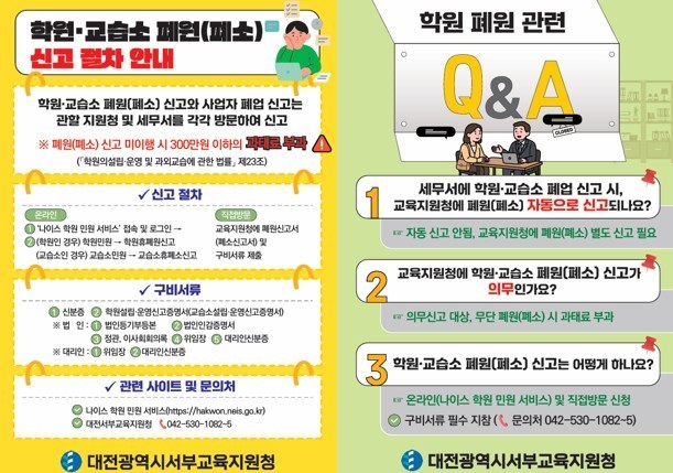 해당 리플릿은 2월 2일부터 관내 세무서 민원실에 비치된다. 이를 통해 학원 및 교습소 운영자가 교육청 미신고 상태에서 세무서에 사업자 말소만 신청하는 경우를 사전에 예방하도록 할 예정이다.