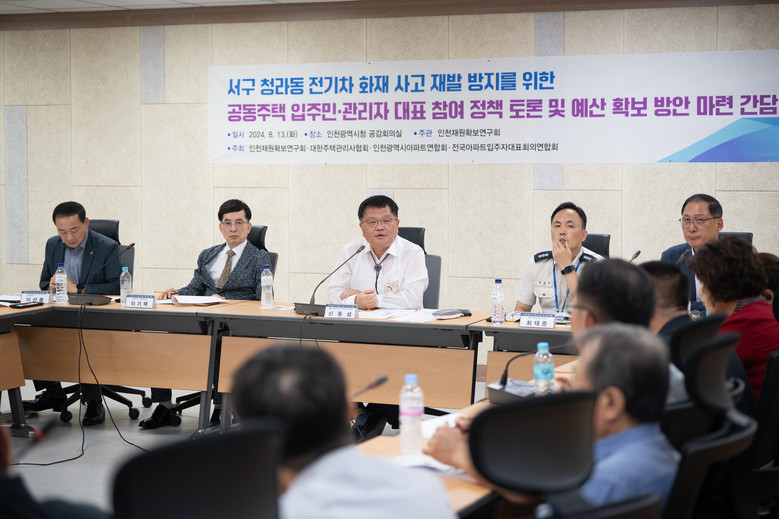 [인천 세계타임즈=심하린 기자] 인천광역시의회 인천재원확보연구회(대표 의원 신동섭)는 13일 인천시 공감회의실에서 대한주택관리사협회, 인천광역시아파트연합회, 전국아파트입주자대표회의연합회 인천지부의 회장 및 협회장 등을 비롯해 각 군·구별 대표들이 참석한 가운데 ‘전기차 화재 사고 재발 방지를 위한 입주민·관리자 대표 참여 정책 토론 및 예산 확보 방안 마련 간담회’를 개최했다.
