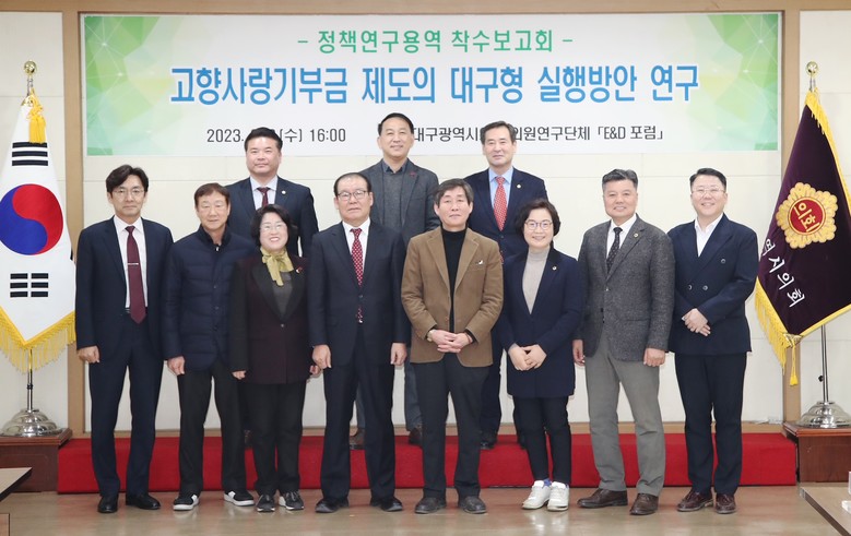 [대구 세계타임즈=한성국 기자] 대구시의회 의원연구단체 ‘E&D포럼’(대표 조경구 의원)은 2월 8일(수) 오후 4시 시의회 3층 회의실에서 소속 의원(대표 조경구, 간사 정일균, 이성오, 임인환, 김태우, 윤권근, 윤영애, 김지만, 이재화, 김원규, 이동욱, 전경원, 육정미)이 참석한 가운데 ‘대구형 고향사랑기부금 제도’ 정책연구용역 착수보고회를 개최했다.
