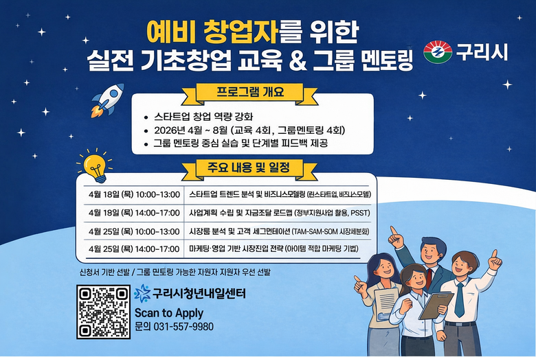 교육은 구리시 청년내일센터 4층 강의실에서 진행되며, 회차별 모집인원은 15명이다. 주요 교육 과정은 ▲4월 18일 10시 창업 초기기업 흐름 분석 및 사업 모형화 ▲4월 18일 14시 사업계획 수립 및 자금조달 로드맵 ▲4월 25일 10시 시장분석 및 고객 세분화 ▲4월 25일 14시 마케팅·영업 기반 시장진입 전략 등으로 구성된다.