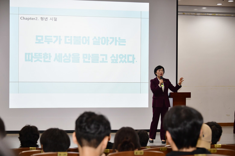 광주대 산업디자인학과 91학번인 신수정 의장은 학창 시절과 청년 시절, 정치입문과 멘토와의 만남을 거쳐 광주광역시의회 개원 34년 만의 첫 여성 의장이 되기까지의 삶의 과정을 바둑의 묘책인 ‘신의 한 수’를 인용해 인생의 중대한 기로의 순간에 감행했던 도전 경험을 후배들에게 소개했다.