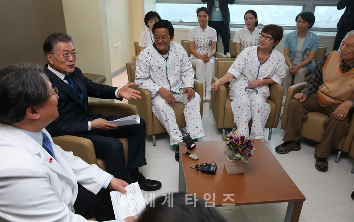 문재인 전 더불어민주당 대표가 5일 오전 서울 중랑구 신내동 보호자 없는 환자안심병원인 서울의료원을 찾아 의료원 관계자, 환자, 보호자 등과 간담회를 하고 있다. 환자안심병원은 병원이 제공하는 간호, 간병세비스를 통해 환자가 보호자나 간병인의 도움 없이 안심하고 입원생활을 유지해 나갈수 있는 병원을 말한다. 2017.02.05.