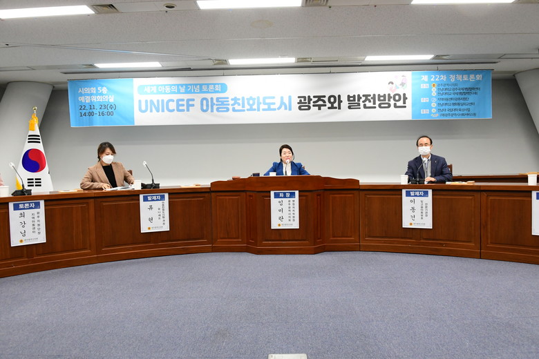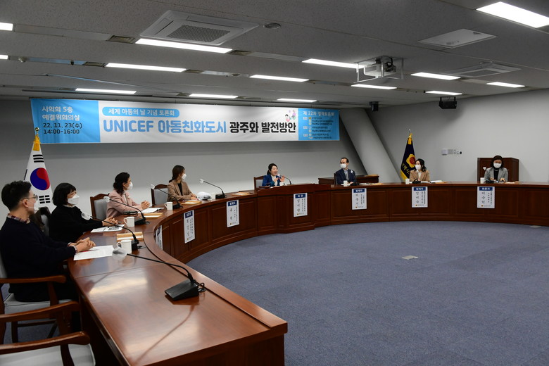임미란 시의원(더불어민주당·남구2)이 좌장을 맡아 23일 시의회 예결위회의실에서‘유니세프 아동친화도시 광주시 발전방안’을 주제로 아동분야 전문가 발제와 토론이 이어졌다.