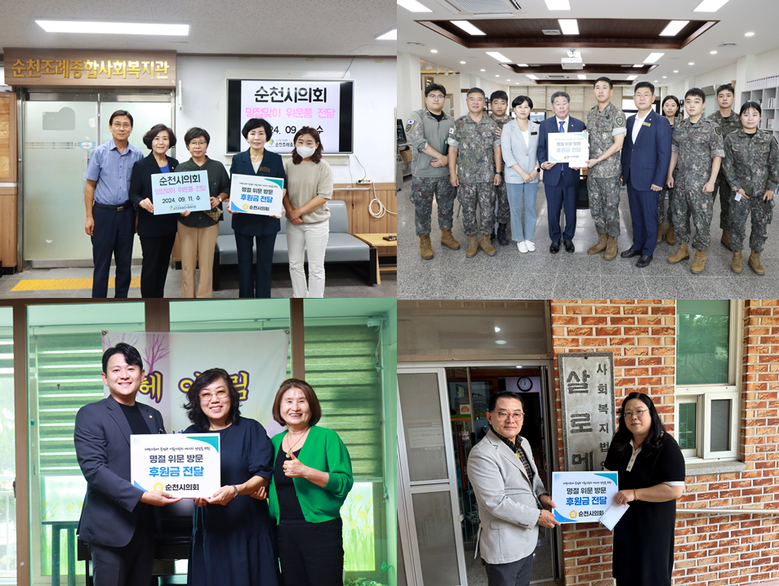 한편, 순천시의회에서는 매년 설, 추석 명절에 군부대와 사회복지시설 등을 찾아 복지 사각지대가 없는 따뜻한 세상 만들기에 힘쓰고 있다.