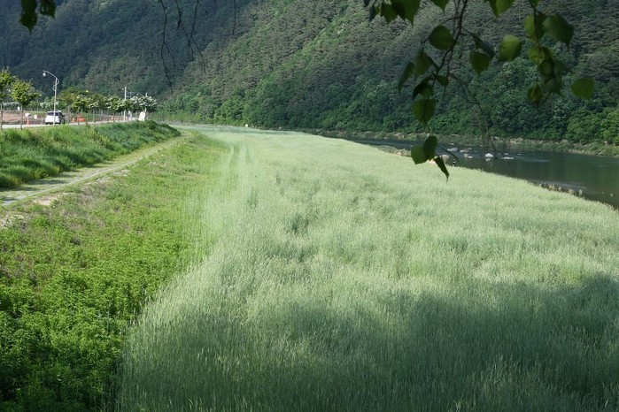 평창강변을 따라 펼쳐진 3만여평의 둔치에 보리 이삭이 패어 한 폭의 수채화 같은 아름다운 풍경을 연출하고 있다.
