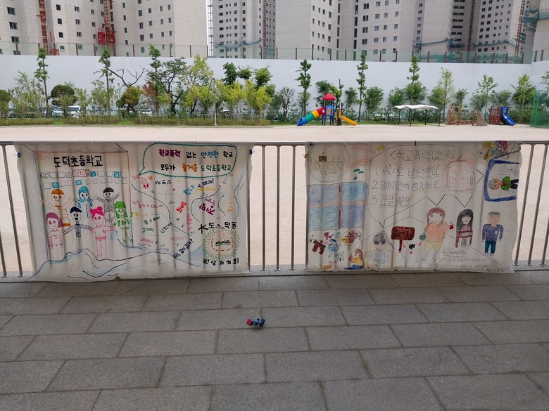 학생자치회 임원들을 중심으로 6학년 학생들이 모여 학교폭력 예방을 주제로 영상을 직접 만들고 전교생에게 상영한 것이다. 학생들이 직접 연출한 10분 길이의 영상을 통해 학생들은 학교폭력 예방에 대한 깊은 공감대를 형성할 수 있었다. 여기에 더해, 아이들의 키를 훌쩍 넘는 커다란 광목천에 <학교폭력 없는 안전한 우리 학교>를 상징하는 깃발도 만들었다. 이렇게 아이들의 힘으로 만든 깃발은, 매일 전교생이 바라보며 모두가 안전하고 즐거운 학교를 만들어가자는 다짐을 하도록 학교 안 통학로에 내다 걸었다.