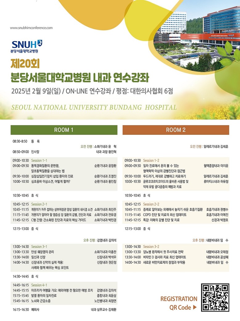 사전등록은 2월 3일(월) 자정까지 분당서울대병원 내과 연수강좌 홈페이지에서 할 수 있다.