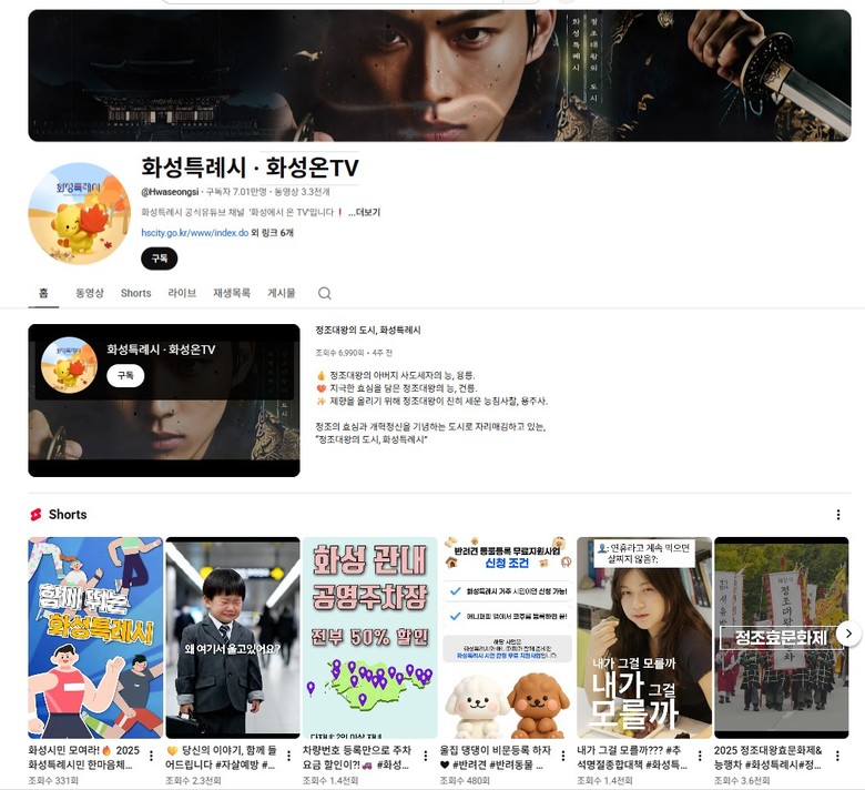 ○ ‘화성특례시X정조대왕 – Hyo(孝) of Love’ 영상, 조회 수 17만 회 돌파 [화성시 세계타임즈=송민수 기자] 화성특례시 공식 유튜브 채널 ‘화성특례시·화성온TV’가 2025년 10월 기준, 전국 226개 기초지자체 중 구독자 수 2위를 기록하며 뜨거운 주목을 받고 있다.