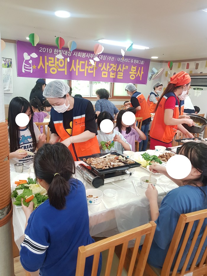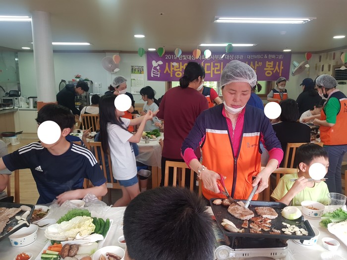폭염날씨에도 신상일 단장, 유희자 단장을 비롯한 자원봉사자 15명은 혜생원 아이들과 함께 저녁식사에 삼겹살과 목살, 새우튀김, 볶음밥을 먹으면서 즐겁고 행복한 시간을 보냈다.