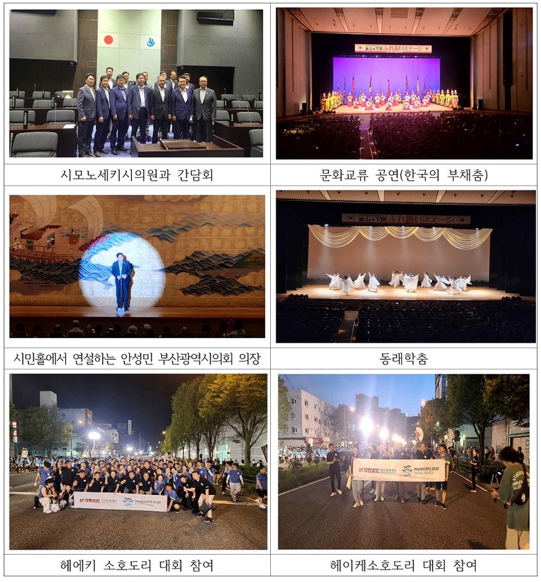 부산광역시의회 대표단은 19일, 부산 예술단 130여 명이 참여한 조선통신사 사행을 시작으로 시모노세키 바칸축제의 문을 열었다. 안성민 의장은 정사 자격으로 시내 1.2km 구간을 순회하는 행렬단을 인솔했으며 미리 준비한 친서를 전달하고 양 도시 우호증진에 대한 기대를 밝혔다.