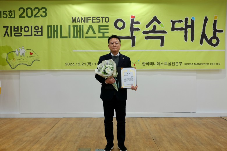 최선국 위원장은 수상소감을 통해 “매니페스토는 주민과의 약속, 올바른 정치의 척도라는 마음으로 임해왔다”며 “앞으로도 지역발전과 주민들의 삶의 질 향상을 위한 입법 활동과 정책 마련에 최선을 다하겠다”고 밝혔다.