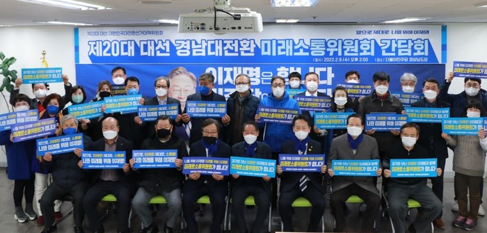 정부의 방역수칙에 맞추어 현장에서 진행된 <미래로소통위원회> 경상남도위원회 대선필승 간담회에는 경상남도위원회 변철호 공동위원장 및 홍권표, 정재영 경남공동위원장을 비롯한 경상남도 직능 대표 등 총 50명의 위원진들이 참석하여 경상남도에서의 이재명 후보의 대선승리를 위한 다짐을 하였다.