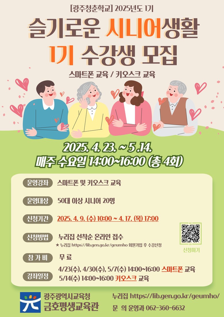 이 밖에 금호평생교육관은 오는 17일 오후 5시까지 누리집을 통해 ‘스마트폰‘ 및 ’키오스크‘ 교육 참가자를 선착순 모집한다.
