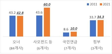 지난 10년간 최대주주 지분 변동, 사모펀드 큰 폭(16.4%p) 증가 2021년 기준 사모펀드나 자산운용사 등(이하 ‘사모펀드’)이 최대주주인 6개사의 경우, 최대주주 지분이 2011년 43.6%에서 2021년 60.0%로 대폭(16.4%p) 늘었다. 정부가 기업 M&A나 자금조달을 활성화한다는 명목으로 사모펀드 규제를 대폭 완화하면서, 금융자본의 기업경영 참여가 늘어난 것으로 보인다.