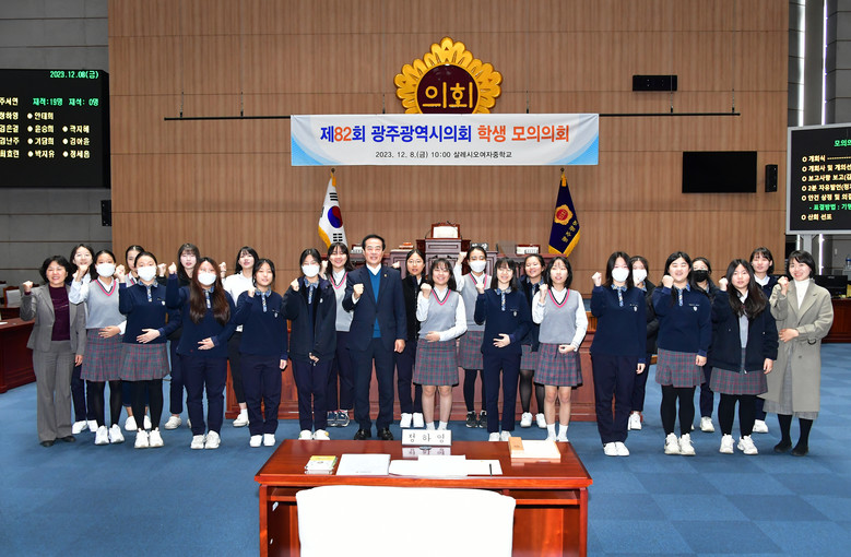 [광주 세계타임즈=손권일 기자] 광주광역시의회(의장 정무창)는 12월 8일(금) 오전 10시 시의회 본회의장에서 살레시오여자중학교 학생들을 대상으로 ‘광주광역시의회 제82회 학생 모의의회’를 개최했다.