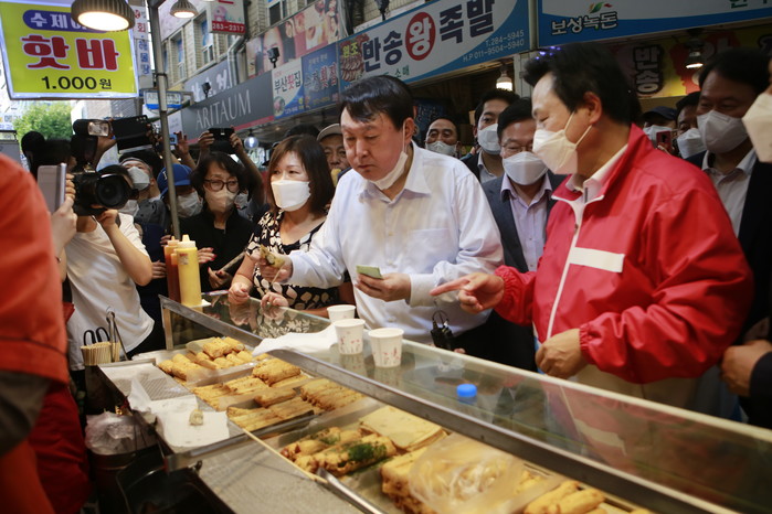 [세계타임즈 이진화 기자]야권 유력대선 후보 국민의힘 윤석열 후보가 추석을 앞두고 경남지역 민심 끌어안기에 방문한 18일 오후 경남 창원 반송시장을 찾아 어묵을 먹고 있다
