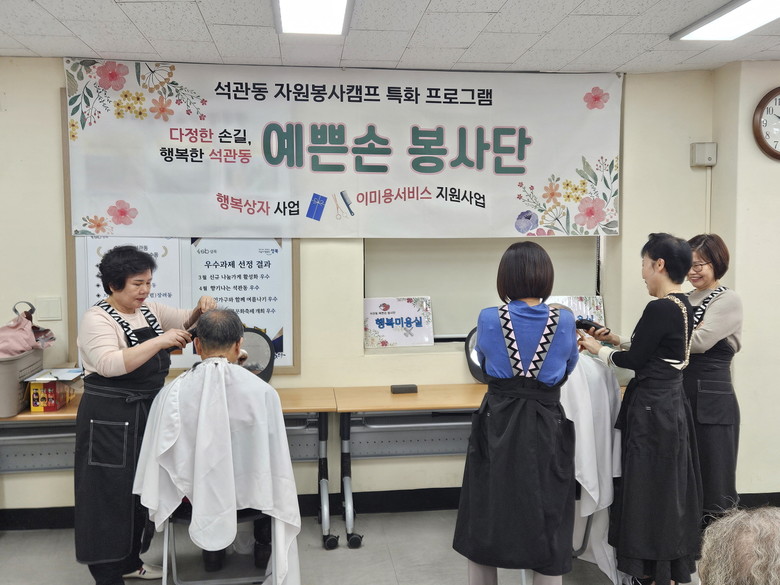 ‘예쁜손 봉사단’은 2018년 5월 석관동 통장들이 뜻을 모아 결성한 단체로, 올해로 8년째 꾸준히 봉사활동을 이어오고 있다. 미용사 자격증을 취득한 김희자·김창순 씨를 중심으로 시작된 이미용 봉사는 단체의 대표 프로그램으로 자리 잡았다. 매월 둘째 주 수요일에는 주민센터를 방문한 어르신들을 대상으로 ‘행복미용실’을 운영하고, 넷째 주 수요일에는 거동이 불편한 어르신이나 장애인 가정을 직접 찾아가는 ‘찾아가는 행복미용실’을 진행한다.