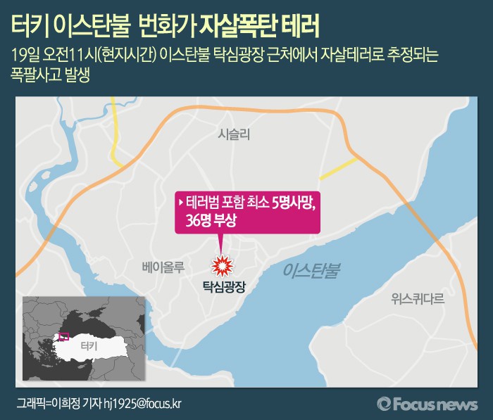 (서울=포커스뉴스) 터키 최대 도시 이스탄불의 탁심 광장 근처에서 19일 오전 11시(현지시간) 자살 폭탄테러로 추정되는 폭발사고가 일어나 최소 5명이 사망하고 36명이 부상당했다.