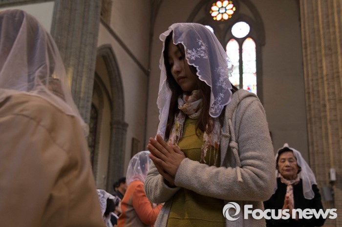 (서울=포커스뉴스) 부활절을 맞아 27일 정오 서울 중구 명동성당에서 열린 '예수 부활 대축일 미사'에 신도들이 참석해 있다.