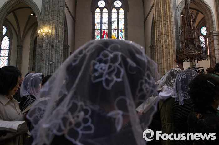 (서울=포커스뉴스) 부활절을 맞아 27일 정오 서울 중구 명동성당에서 열린 '예수 부활 대축일 미사'에 신도들이 참석해 있다.