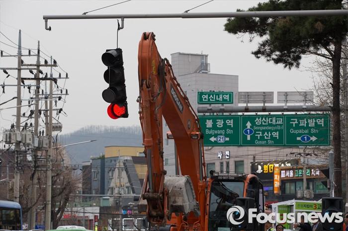 (서울=포커스뉴스) 6일 오후 서울 은평구 연신내 물빛공원에서 고연호 국민의당 은평구을 후보의 유세가 끝나고 철수하던 포크레인이 신호등을 건드려 망가졌다.