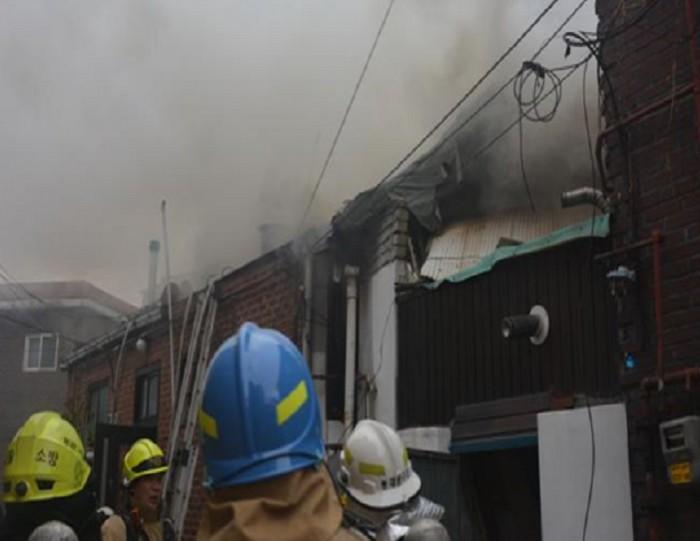 소방당국과 경찰은 1층 거실에서 불이 시작된 것으로 보고 정확한 화재 원인을 조사중이다.8일 오전 7시 35분쯤 서울 동대문구 청량리동 주택에서 불이 나 출동한 소방관이 불을 끄고 있다. <사진제공=서울 동대문소방서>