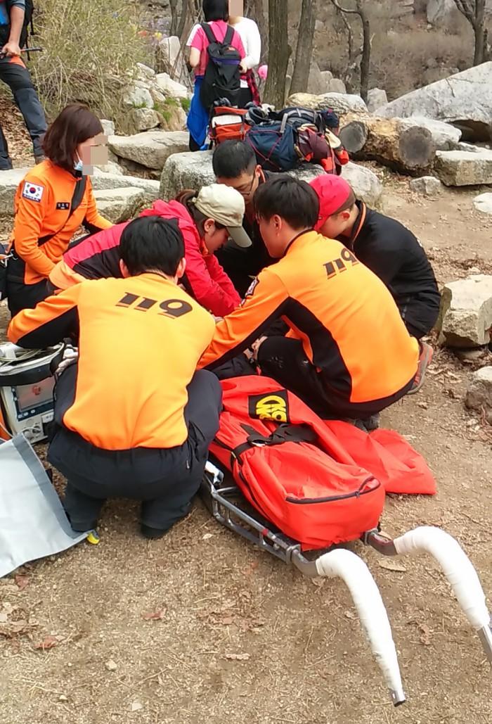 소방당국은 "봄 등산철에 각종 안전사고에 각별히 유의해야 한다"고 당부했다.9일 오후 서울 도봉산에서 60대 남성이 산행 중 심정지로 쓰러져 응급처치를 받고 있다. <사진제공=119특수구조단>