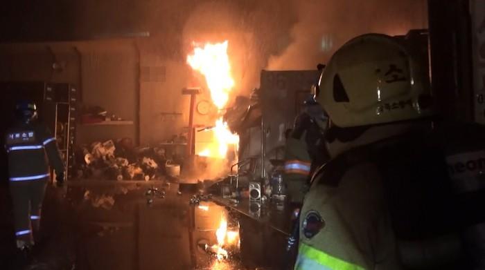 경찰과 소방당국은 샌드위치 판넬로 만든 사무실 내부에서 처음 불이 난 것으로 보고 정확한 원인을 조사 중이다.17일 서울 성북구 성관동에 위치한 고물상에서 불이 나 소방대원들이 진화 중이다. <사진제공=서울 성북소방서>