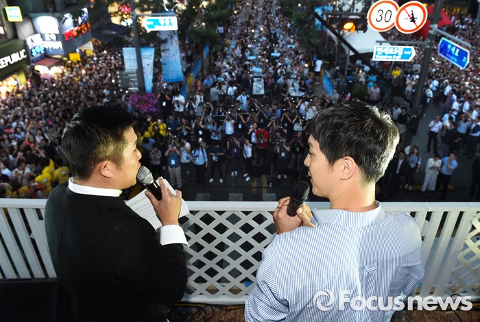 (서울=포커스뉴스) 14일 오후 서울 서대문구 신촌 일대에서 열린 '제2회 신촌맥주축제'에 참석한 배우 송중기(오른쪽)와 개그맨 조세호가 대화하고 있다.