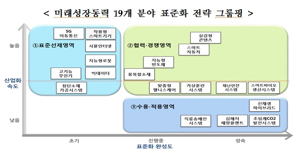 정부는 미래성장동력 분야의 글로벌 주도권 확보를 위한 핵심기술 표준화 전략을 추진한다. 미래성장동력 분야(스마트카 등 19대 분야)의 기술역량, 산업화 속도, 표준화 현황 등을 진단하고 수준별 맞춤형 표준화전략을 마련했다. 이번에 보고한 표준화 전략에 따르면 2020년까지 세계 4위권의 표준특허 확보 국가가 되는 것이 목표다.